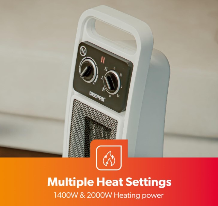 فن هیتر Geepas PTC با یک المنت گرمایشی سرامیکی کم مصرف، این بخاری فضایی دارای 2 تنظیم، حرارت بالا (2000 وات) و حرارت کم (1400 وات)، به علاوه گزینه ای فقط فن برای از بین بردن سریع نقاط سرد در میز، دفتر، اتاق شما است. ، و خانه فناوری گرمایش سرامیکی پیشرفته PTC همراه با فن فوق کارآمد هر فضا را سریعتر گرم می کند و گرما را به طور یکنواخت توزیع می کند. فقط بخاری قابل حمل خود را روشن کنید، از گرمای خانه، اداره، دسکتاپ و داخل خانه لذت خواهید برد.