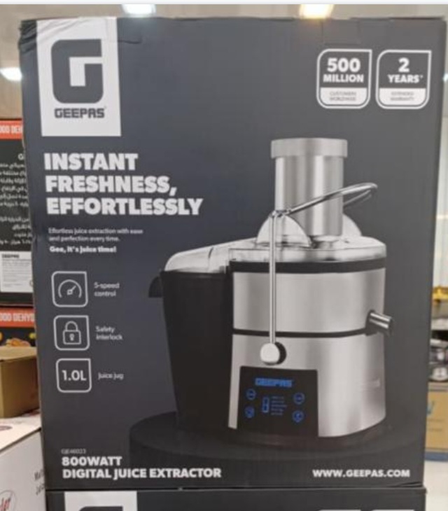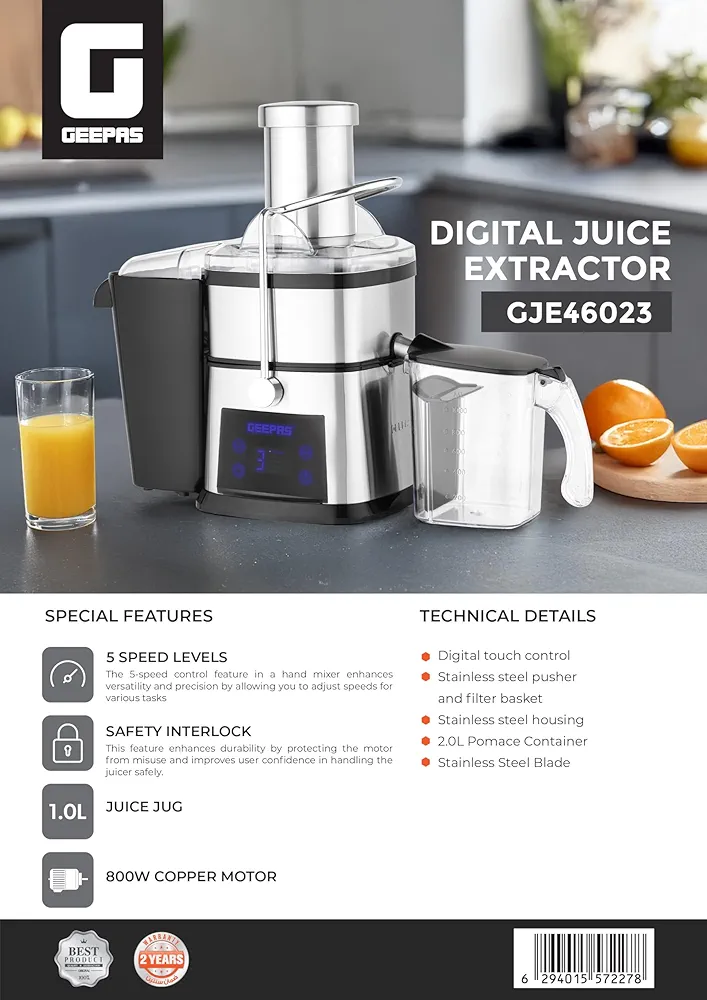 آبمیوهگیری جیپاس مدل GJE46023 یکی از محصولات مدرن و قدرتمند برند معتبر Geepas است که با طراحی شیک و امکانات کاربردی خود، تجربهای متفاوت از تهیه آبمیوههای طبیعی و سالم را برای شما به ارمغان میآورد. این دستگاه با توان 800 وات عملکردی قوی و سریع دارد و بهراحتی انواع میوهها و سبزیجات را آبگیری میکند.