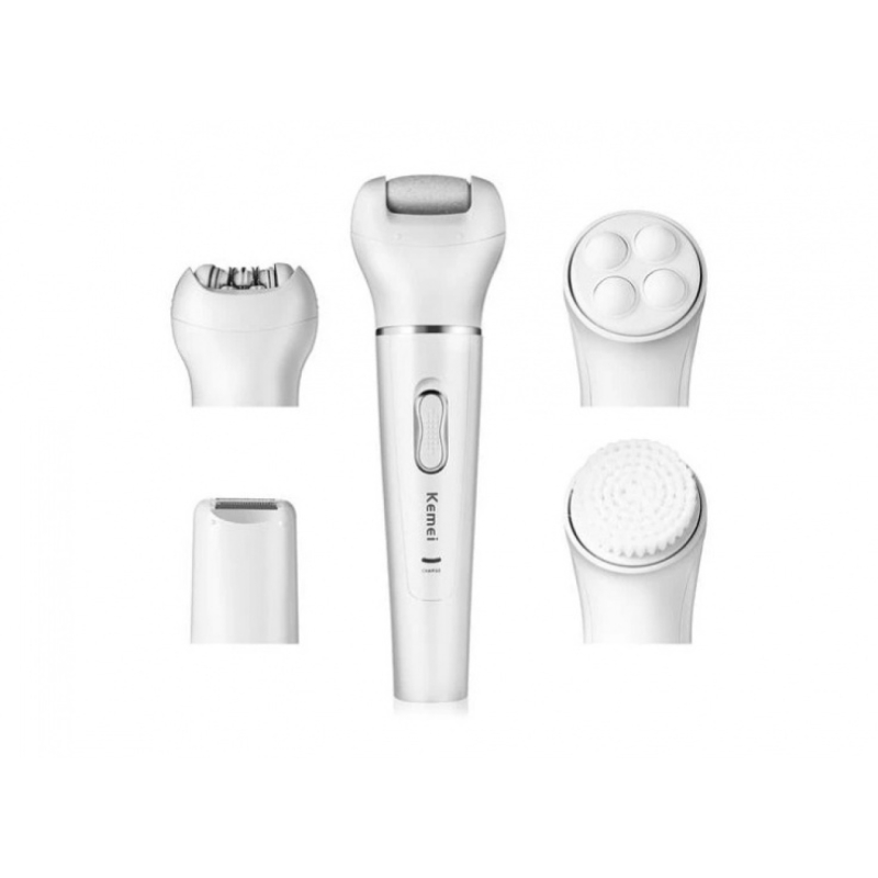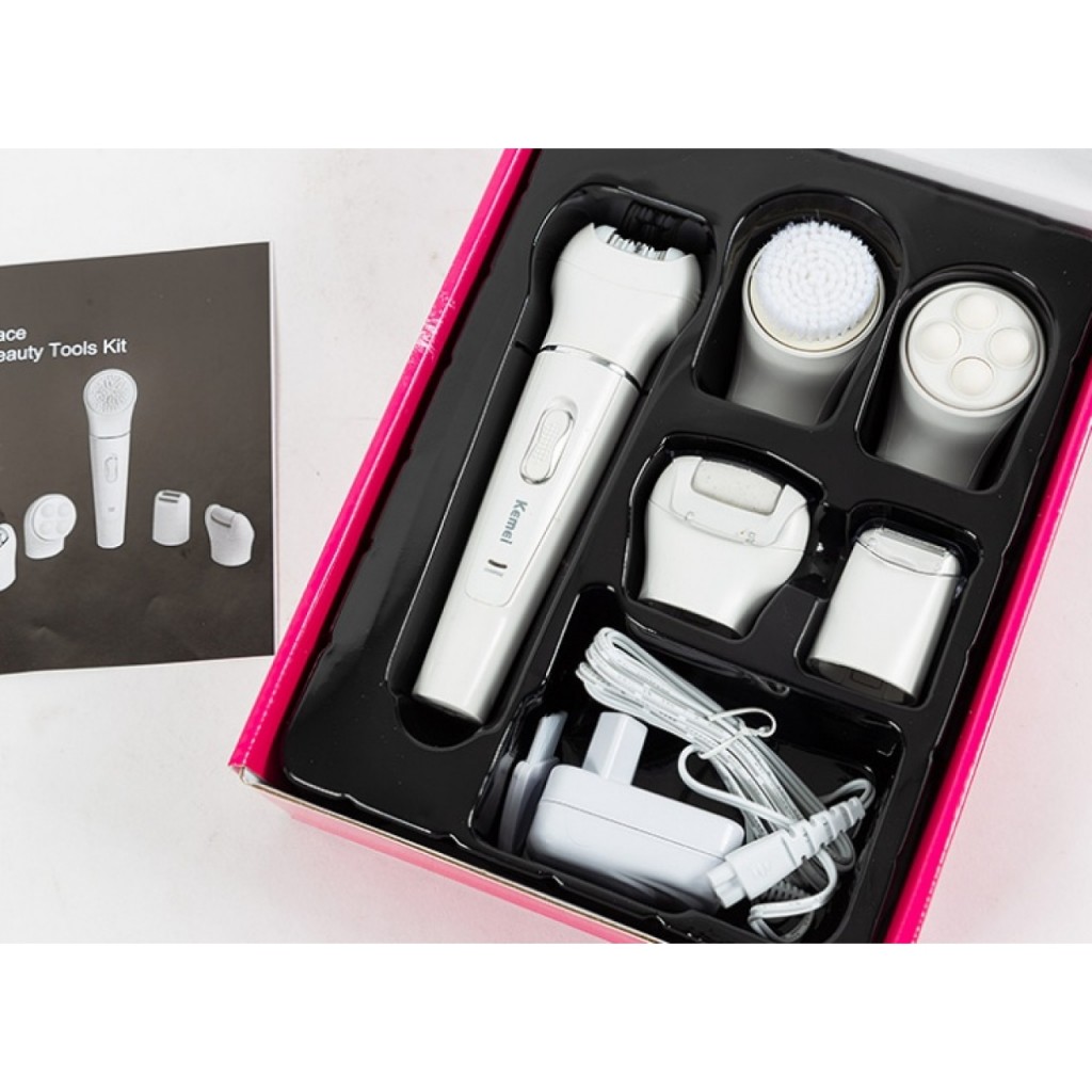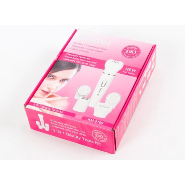 اپیلاتور 5 کاره کیمی مدل KM-2199 کاره که دارای ۵ سری مختلف که هر کدام مخصوص یک کار می باشد سری اولیه که نصب بر روی خود دستگاه می باشد برای پاکسازی و از بین بردن موهای کل بدن می باشد و سری فرچه ای یکی دیگر از سری های این دستگاه می باشد برای پاکسازی کل پوست مخصوصا قسمت های ارایش شده و سری ماساژور برای ماساژ کل بدن و صورت فراهم شده است و سری دیگر برای اصلاح مو ابرو و خط زنی می باشد و یکی دیگر از سری ها مخصوص سوهان پا یا همان سنگ پای قدیمی خودمان نام بره میشود و به عنوان از بین برنده پوست های مرده بدن استفاده میشود.