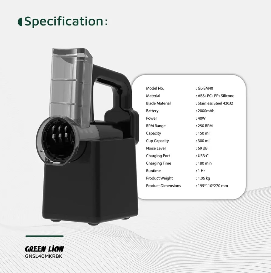 سالاد ساز گرین لاین مدل GL_SM40 | جنس تیغه: استیل ضد زنگ 420J2 جنس: ABS + PC + PP + سیلیکون زمان شارژ: 180 دقیقه پورت شارژ: USB-C ظرفیت لیوان: 300 میلی لیتر محدوده دور در دقیقه: 250 دور در دقیقه میزان صدا: 69 دسی بل باتری: 2000 میلی آمپر ساعت ظرفیت: 150 میلی لیتر زمان کارکرد: 1 ساعت توان: 40 وات |