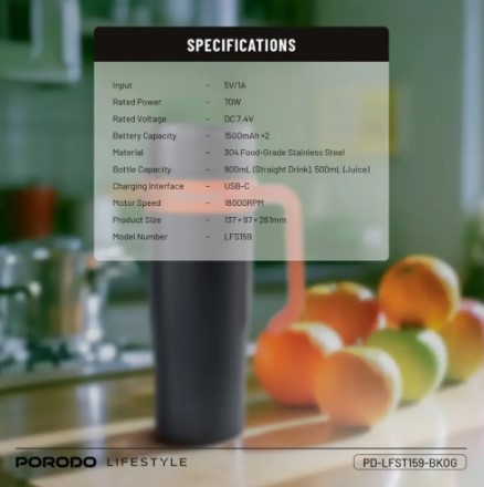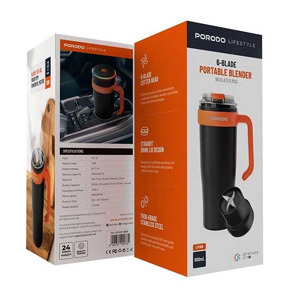 | مخلوط کن قابل حمل پرودو مدل LFS159 | برند: Porodo مدل: 6-BLAD PORTABLE BLENDER LFS159 محل ساخت: چین توان موتور: 70 وات سرعت موتور: 18000 دور در دقیقه باتری داخلی: دو عدد 1500 میلیآمپر ساعتی (قابل شارژ) ظرفیت: 900 میلیلیتر (نوشیدنی)، 500 میلیلیتر (آبمیوه) جنس تیغه: استیل ضد زنگ 304 مخصوص مواد غذایی نوع شارژ: USB-C ویژگیها: تیغه 6 پره قدرتمند، قابلیت نگهداری دما تا 5–6 ساعت، طراحی خاص و قابل حمل |