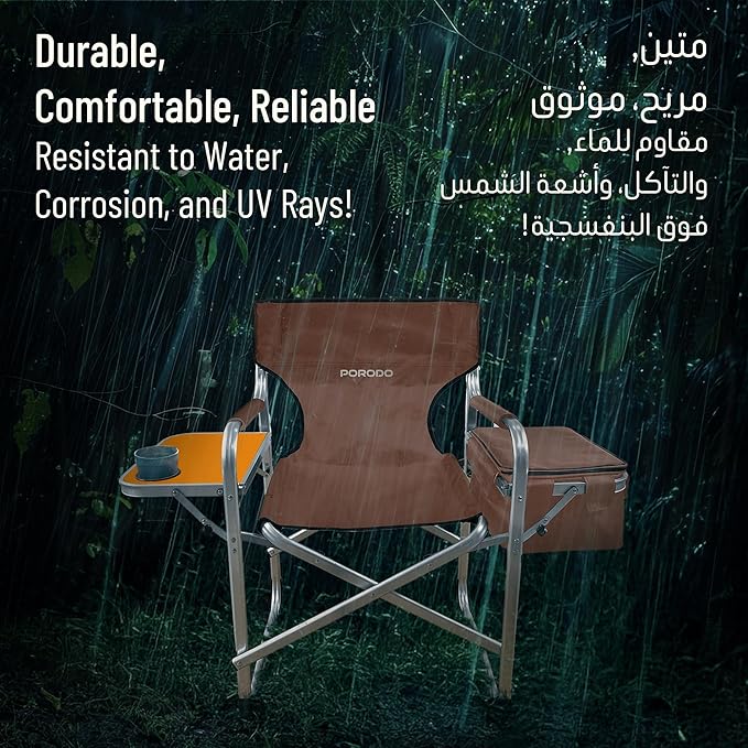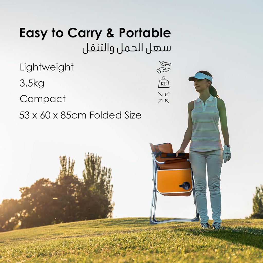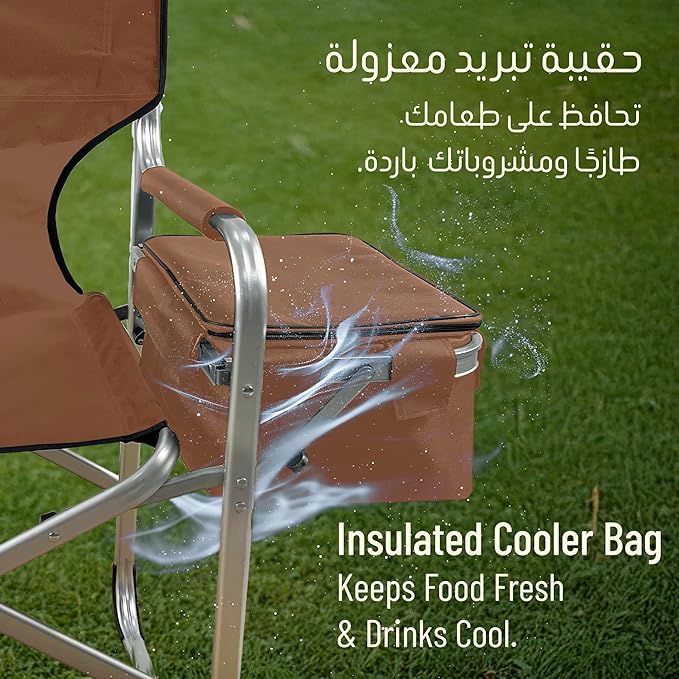 این صندلی دارای کیسه خنککننده عایق برای نگهداری نوشیدنیها، میز جانبی برای قرار دادن وسایل، جای لیوان، پایه ضد لغزش برای ثبات بیشتر و مسند بازو قابل جدا شدن برای راحتی بیشتر است.