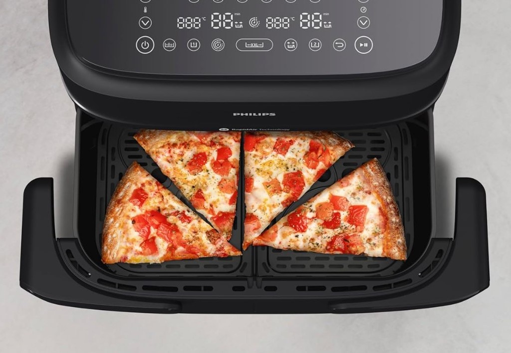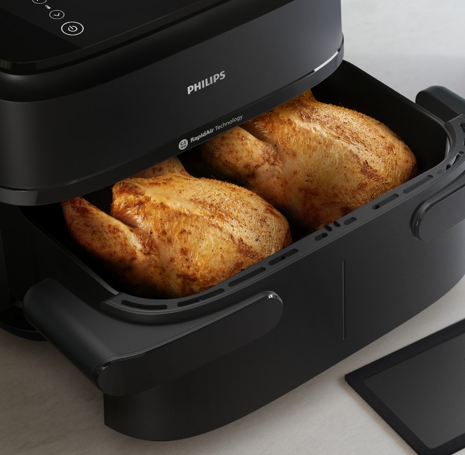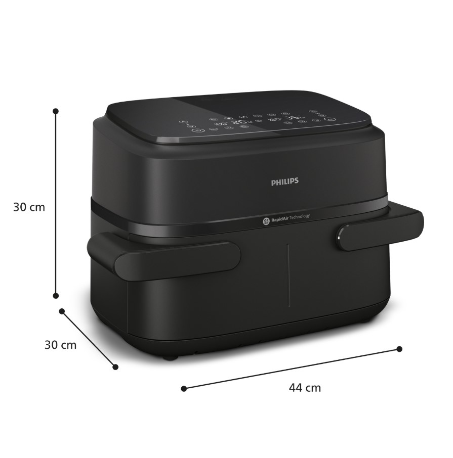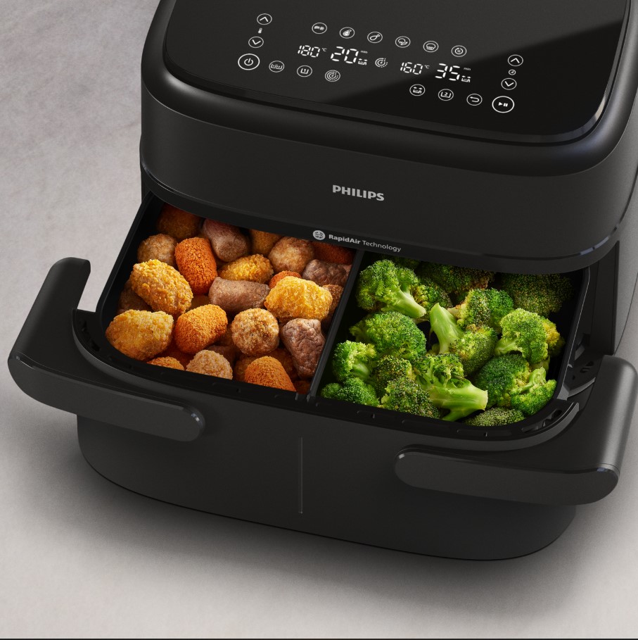 از آنجایی که این سرخ کن دارای دو محفظه پخت بوده می توان درون هر محفظه مواد غذایی یکسان یا متفاوت را قرار داده و آماده کرد. شما می توانید زمان های پخت را به طور خودکار در 2 کشو همگام سازی کنید تا هر دو غذای شما با هم آماده سرو شوند. هنگام آشپزی با این سرخ کن دو سبدی فیلیپس در مقایسه با فر سنتی، تا 40٪ سریع تر بپزید و تا 75٪ در مصرف انرژی صرفه جویی کنید. سیستم خاموش شدن خودکار ایمنی دستگاه را افزایش داده و همچنین احتمال سوختن را به شدت کاهش می دهد.