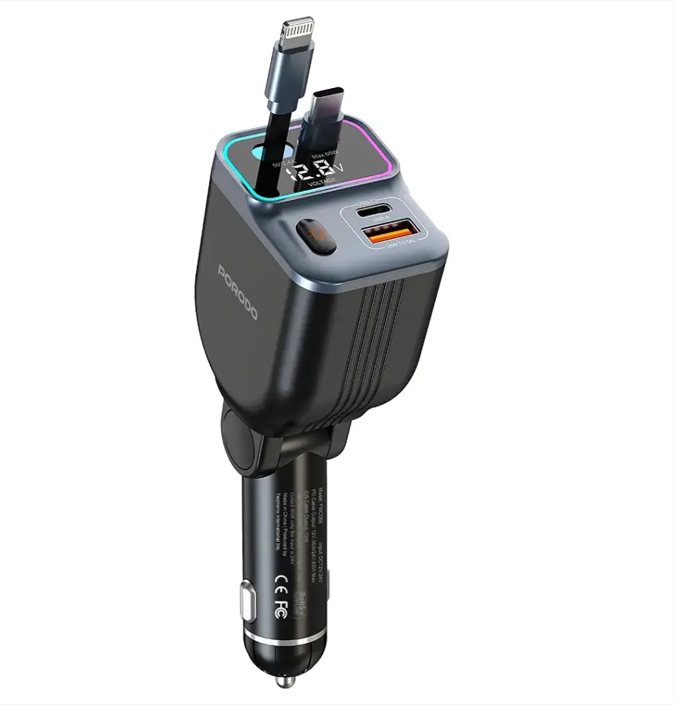 | شارژر فندکی 65 وات پرودو مدلPorodo 65W Car Charger Dual Retractable Cable PDFWCH068BK |