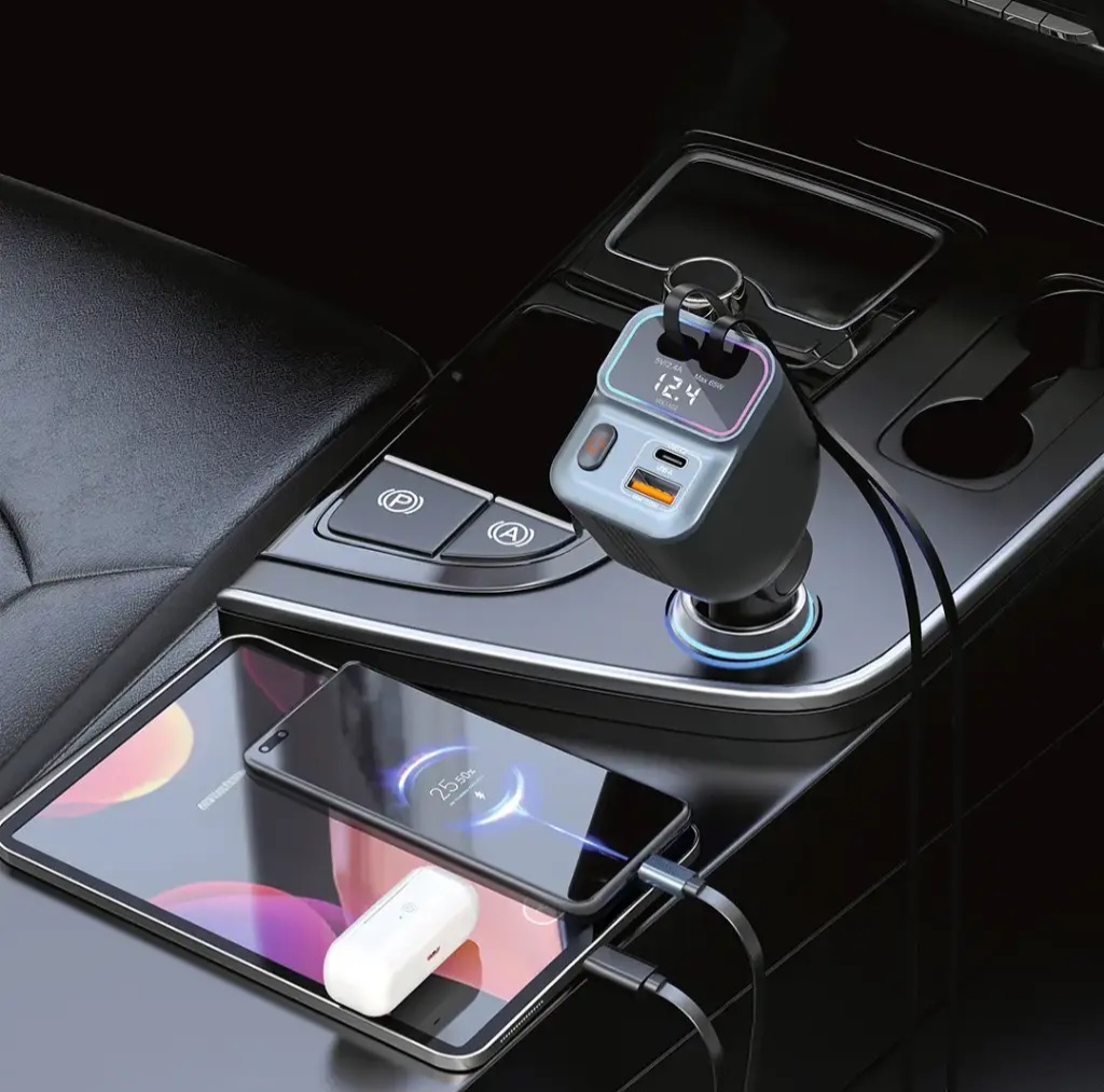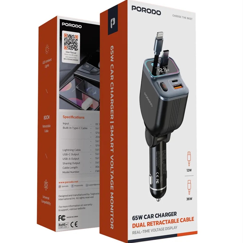 شارژر فندکی 65 وات پرودو مدل Porodo 65W Car Charger Dual Retractable Cable PDFWCH068BK