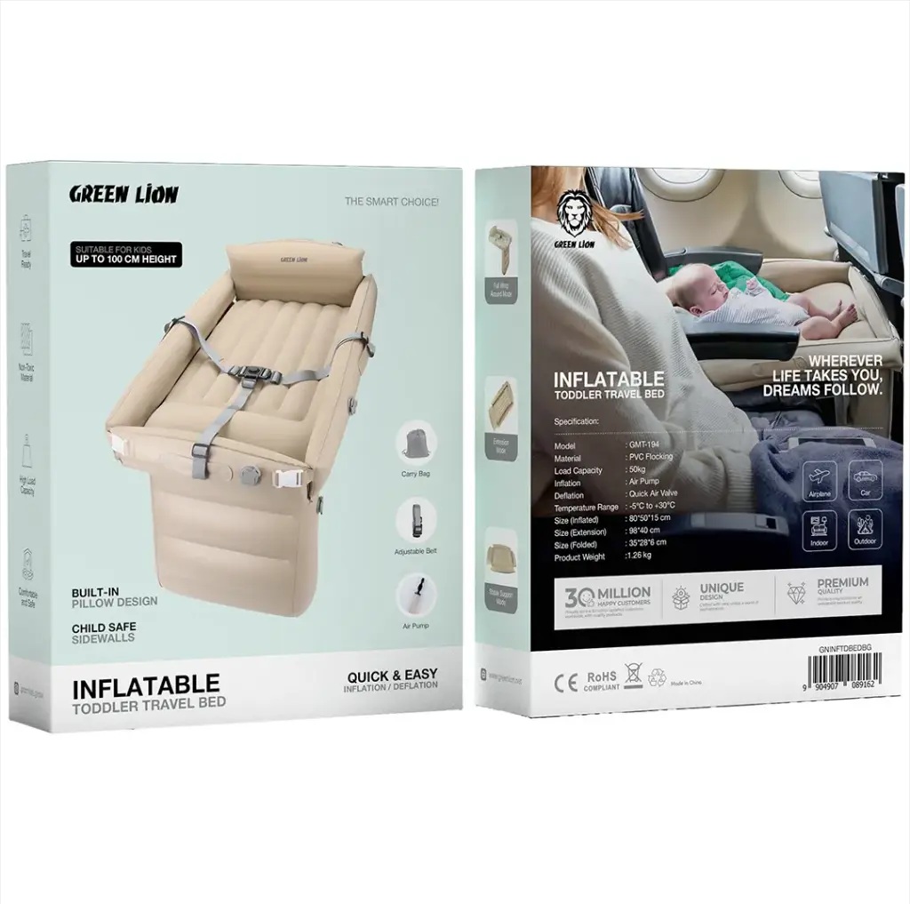 تخت خواب بادی مسافرتی کودک گرین لاین برای سفر ایدهآل است. این تخت به کودک شما کمک میکند تا راحت و ایمن بخوابد، مهم نیست کجا میروید. این تخت برای کودکان تا قد ۱۰۰ سانتیمتر طراحی شده است. این تخت خواب دارای یک بالش داخلی است که راحتی بیشتری را ارائه میدهد و آن را مانند یک تخت خواب دنج برای کودک میکند.