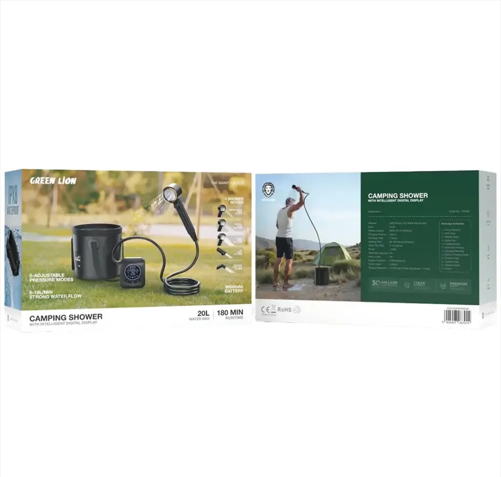 دوش دیجیتال قابل حمل هوشمند گرین لاین به رنگ مشکی یکی از بهترین دوشهای قابل حمل موجود در بازار برای فعالیتهای فضای باز است. این دوش با دو باتری ۴۰۰۰ میلیآمپر ساعتی (در مجموع ۸۰۰۰ میلیآمپر ساعت) کار میکند و ۸۰ تا ۱۸۰ دقیقه زمان کار را فراهم میکند. تجدید قوا در هنگام کمپینگ، پیادهروی یا ساحل تنها یکی از راههای زیادی است که میتوانید از یک دوش با طراوت لذت ببرید. همچنین شامل یک کیسه آب ۲۰ لیتری با سرعت جریان ۵ تا ۱۰ لیتر در دقیقه و ۵ تنظیم فشار قابل تنظیم برای مطابقت با ترجیحات مختلف جریان آب است.